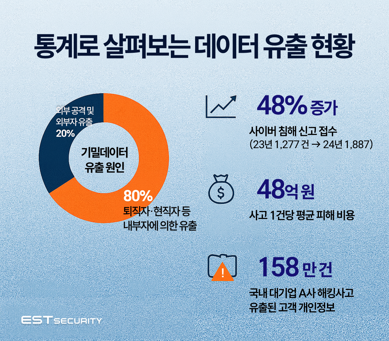 사고가 발생했을 때의 피해 비용도 치명적입니다. 국내 기준 데이터 유출 1건당 평균 피해 금액은 약 48억 원에 달하는데, 이는 단순한 금전 손실을 넘어 고객 신뢰와 기업 이미지에도 장기적인 타격을 줍니다.