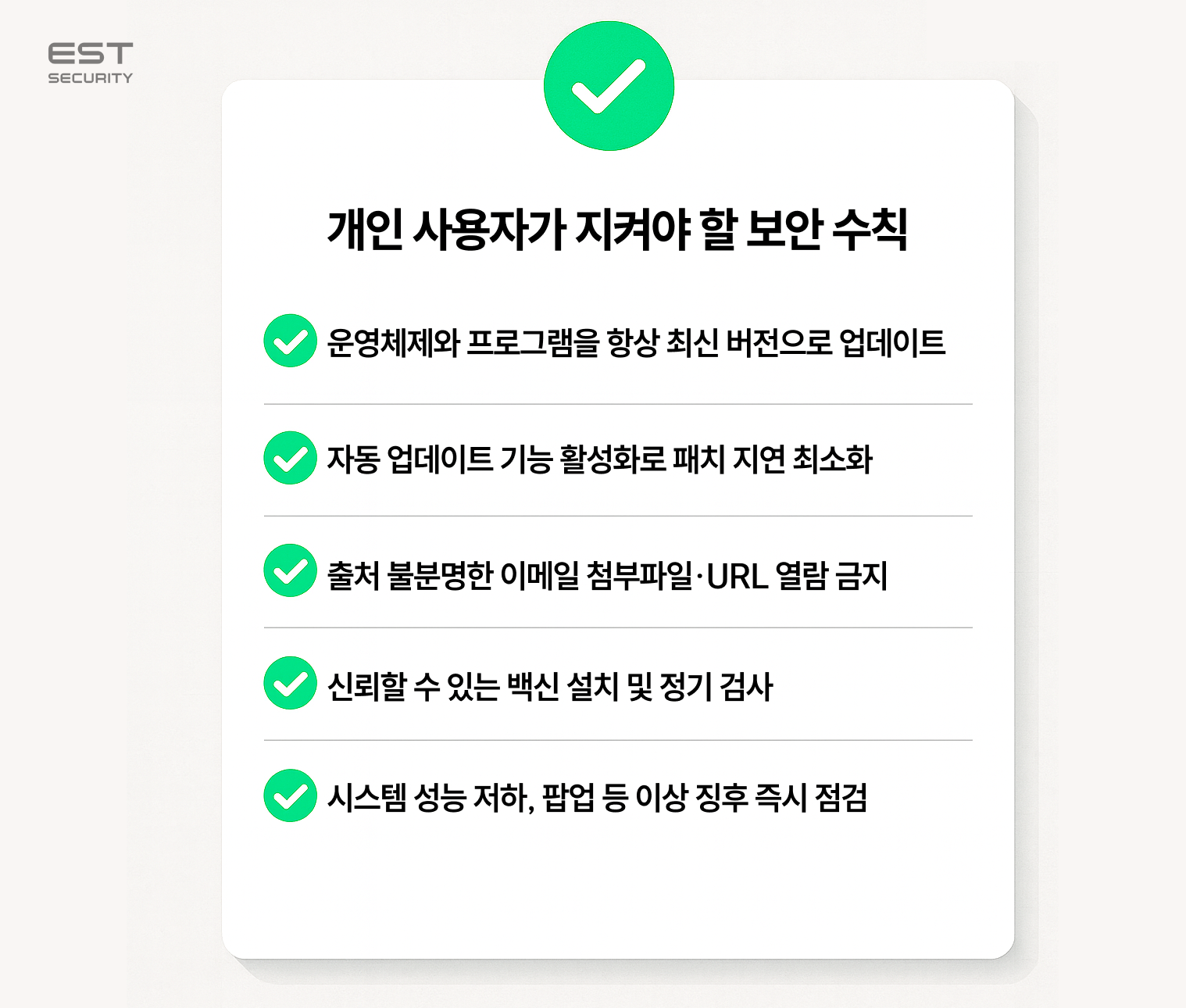 핵심은 업데이트·주의·백신·점검 네 가지로, 이를 생활화하는 것이 안전한 디지털 환경을 지키는 가장 확실한 방법입니다!