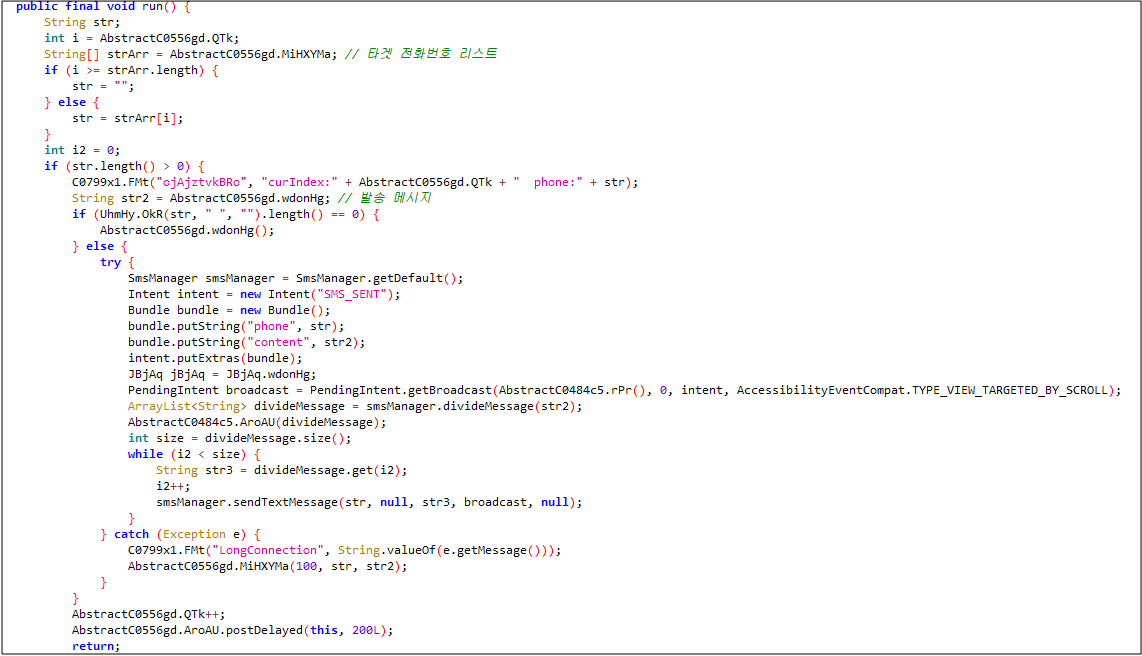 이 과정은 약 0.2초(200ms) 간격으로 반복되어, 짧은 시간 안에 대량의 스미싱 문자가 빠르게 확산되도록 제작되었습니다.