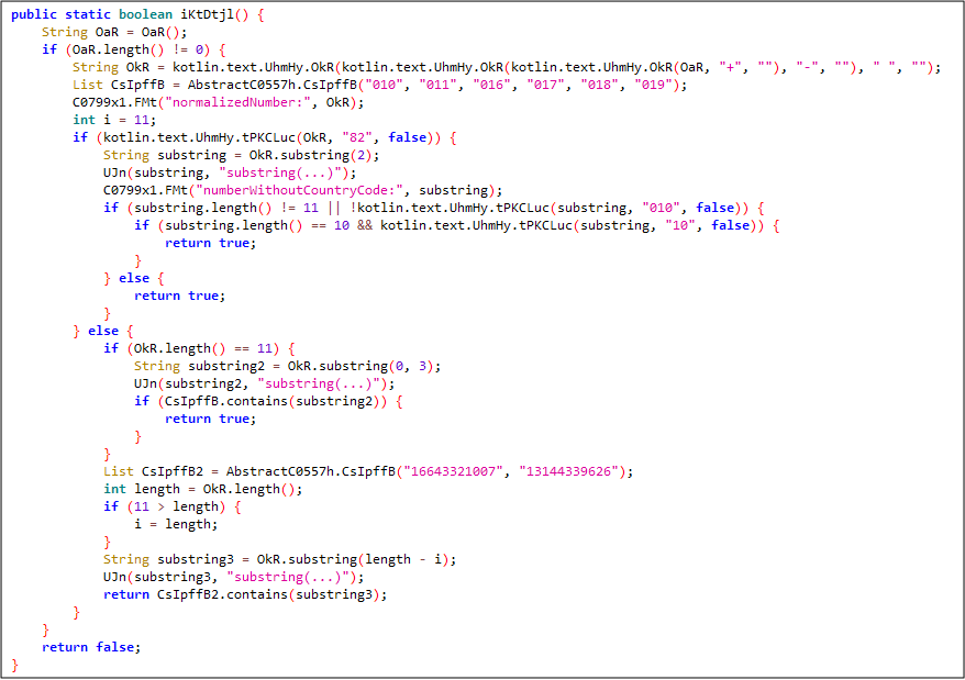 권한 설정 완료 후 백그라운드에서 실행되는데 이때 010,011,016,017,018,019 같은 국내 휴대폰 번호의 프리 픽스를 체크하며, +82 와 같이 한국국가 코드가 아닐 시 동작하지 않게 됩니다.