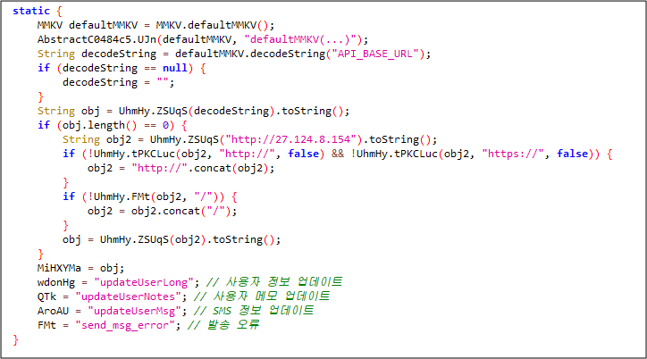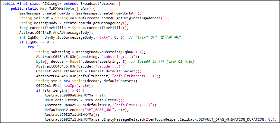 수신된 SMS 분몬에 “txt-” 문자열이 확인되면 해당 문자열 뒤에 붙은 Base64로 인코딩 된 문자열을 디코딩 하여 새로운 C2 서버로 사용합니다.