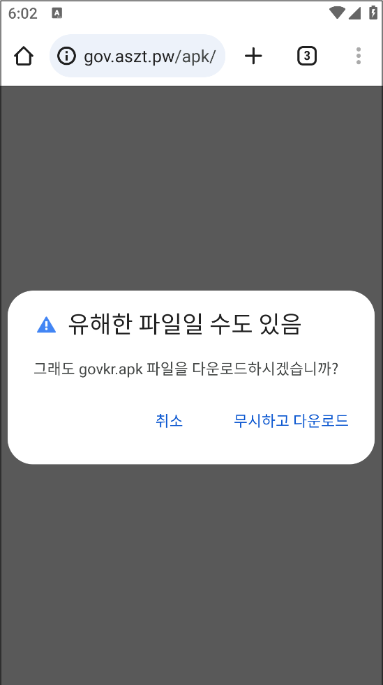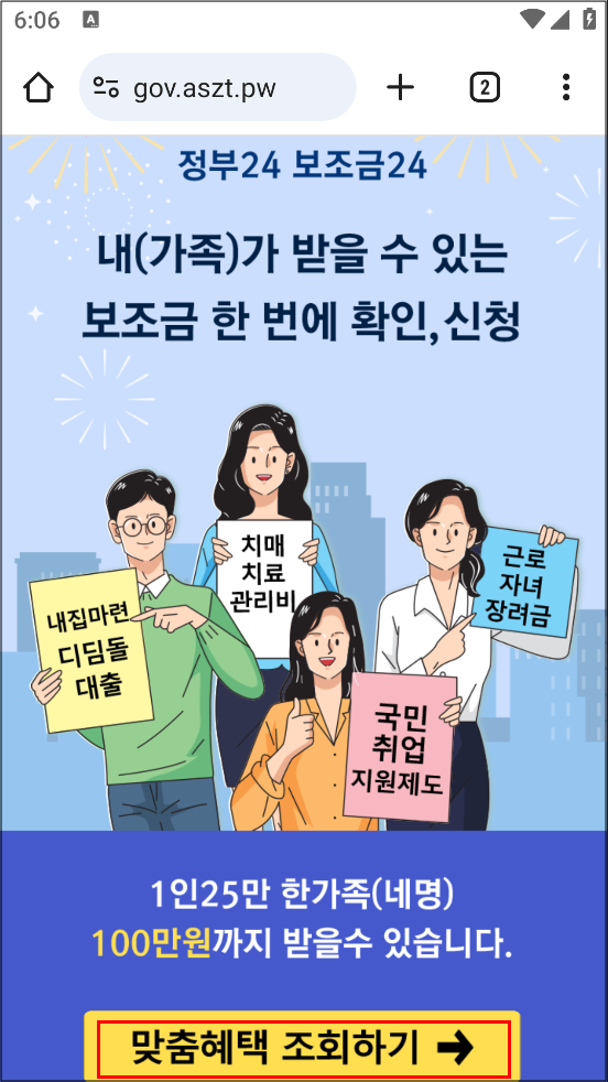 사용자가 해당 링크를 클릭하게 되면 정부24 사이트를 위장한 피싱 페이지로 접속되며, [맞춤 혜택 조회하기]버튼 클릭시 apk 파일 다운로드 및 앱 설치를 유도합니다.
