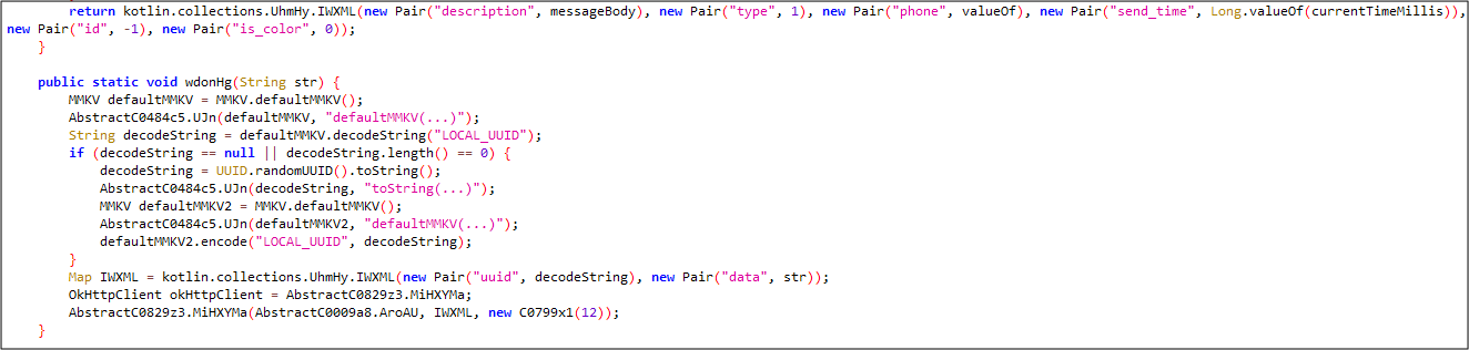공격자 서버(C2)로 전송 시 본문, 발신번호, 수신시각을 포함하여 ‘단말기 uuid + sms (json)’ 를