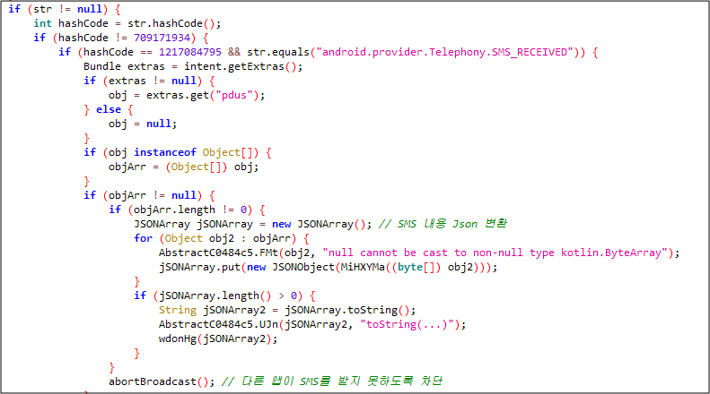 SMS 수신 가로채기는 AbortBroadcast 메서드를 사용하여 다른 앱에서 SMS를 받지 못하게 차단하며, 사용자 기기로 수신되는 SMS를 공격자 서버(C2)로 전송합니다.