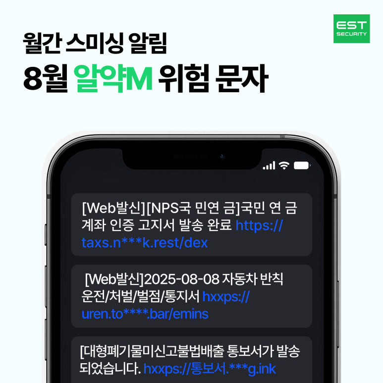 스미싱은 한 번의 클릭으로도 개인을 넘어 가족·지인까지 피해가 확산될 수 있습니다. 이스트시큐리티와 알약M이 제공하는 최신 스미싱 사례와 보안 수칙을 꼭 확인하시고, 안전한 모바일 환경을 지켜가시기 바랍니다.