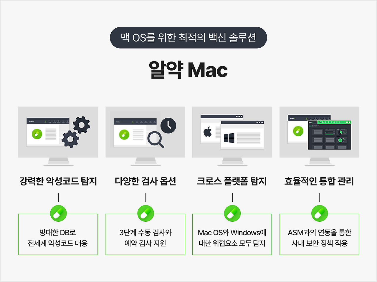 알약 Mac은 MacOS 환경에 최적화된 백신과 ASM 연동을 통한 통합 관리 기능으로, 개인 사용자부터 기업 환경까지 모두 안전하게 보호할 수 있는 전문 솔루션입니다.
