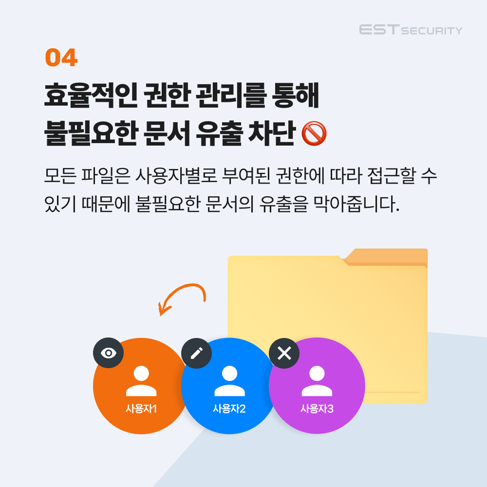 부서, 프로젝트, 폴더 단위 등 세분화된 권한 설정으로 문서 접근을 엄격히 통제합니다. 복사, 출력, 캡처뿐 아니라 웹메일, 아웃룩, 메신저, 웹하드로의 온라인 첨부도 차단하며, USB·CD 등 저장 매체로의 저장 역시 원천 차단해 자료 유출 경로를 최소화합니다.