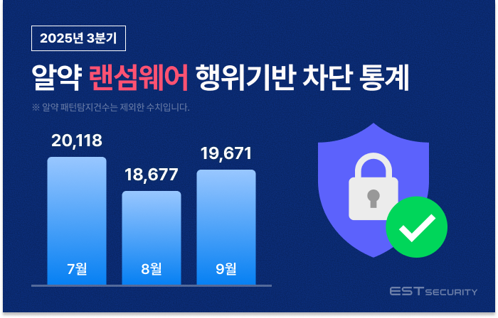 2025년 3분기 자사 백신 프로그램 ‘알약’에 탑재되어 있는 ‘랜섬웨어 행위기반 사전 차단’ 기능을 통해 총58,466건의 랜섬웨어 공격을 차단했으며, 이를 일간 기준으로 환산하면 일 평균 649건의 랜섬웨어 공격을 차단한 것으로 볼 수 있습니다.