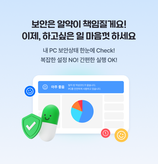 새로워진 알약 3.0은 사용자 인터페이스를 전면 개편했습니다. 보안 상태를 알약 캐릭터로 시각화해 한눈에 확인할 수 있고, 필요한 기능은 클릭 한 번으로 실행됩니다. 자동 업데이트와 예약 검사 등 자동화 기능으로 별도 조작 없이도 안전한 PC 환경을 유지합니다.