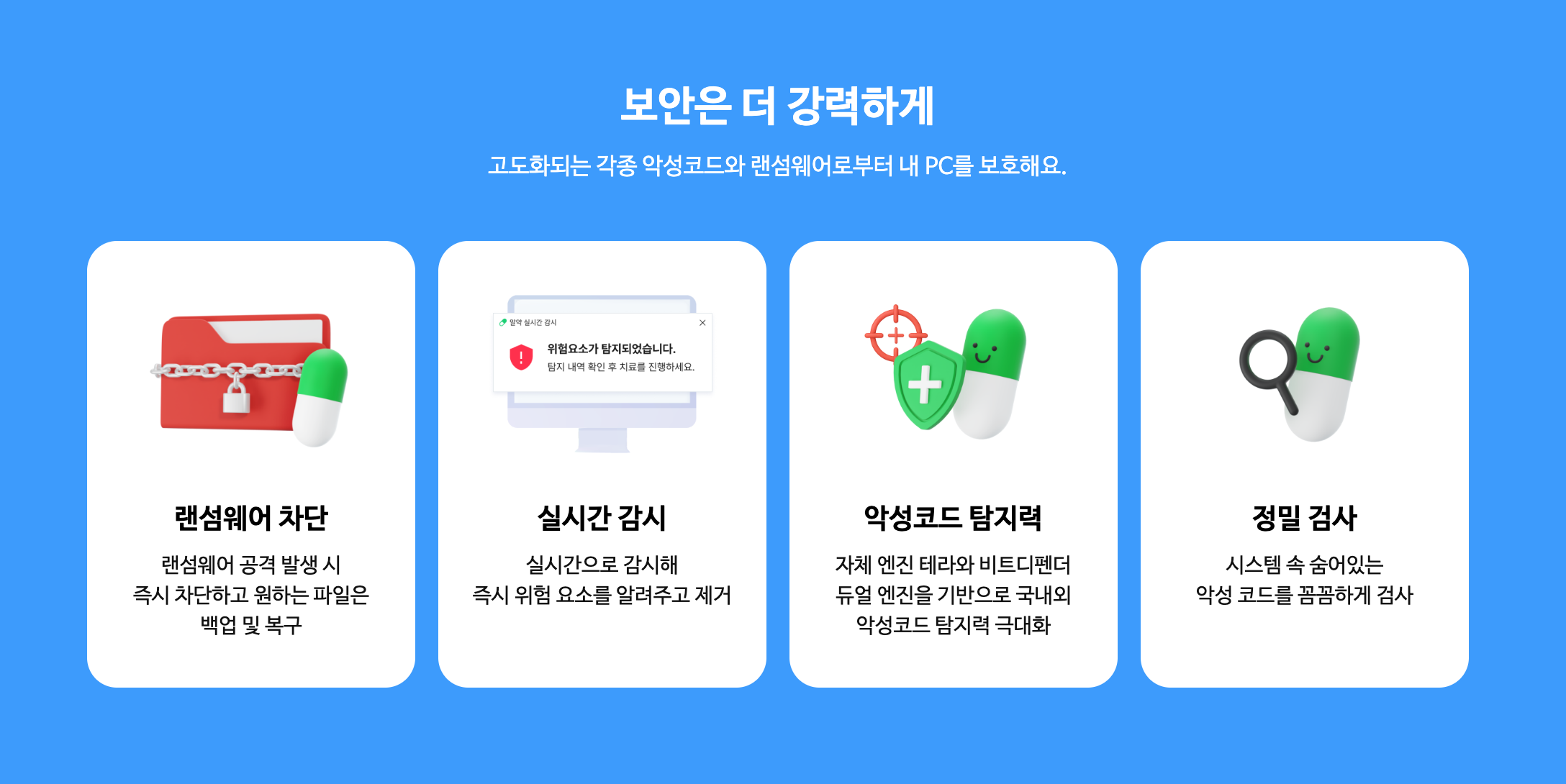 이러한 확산 공격을 차단하기 위해 알약 3.0은 파일이 실행되기 전의 ‘행동 패턴’을 분석하는 차세대 엔진을 적용해 신종 악성코드와 랜섬웨어를 사전에 차단하도록 설계되었습니다. 모바일 단계에서 탐지되지 못한 위협이 PC로 넘어오더라도 마지막 방어선에서 확실하게 차단할 수 있다는 점에서, PC 보안의 핵심 역할을 수행합니다.