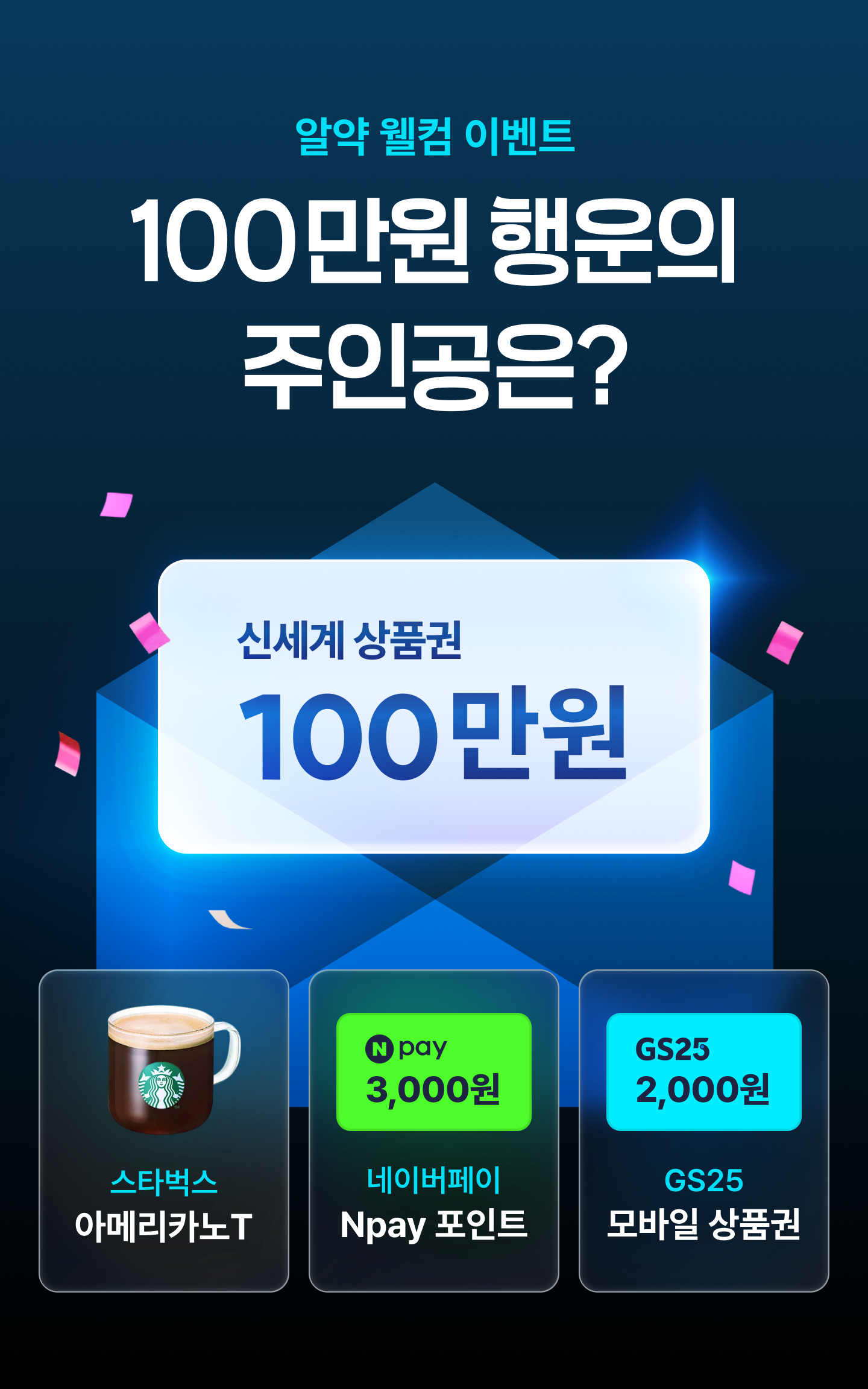 알약 모바일 앱을 신규 설치해 주신 모든 분들을 위한 웰컴 이벤트가 진행중입니다. 앱 설치 후 응모 버튼만 클릭하면 누구나 간단히 참여할 수 있으며, 추첨을 통해 신세계 100만 원 상품권을 포함한 다양한 경품을 드립니다.