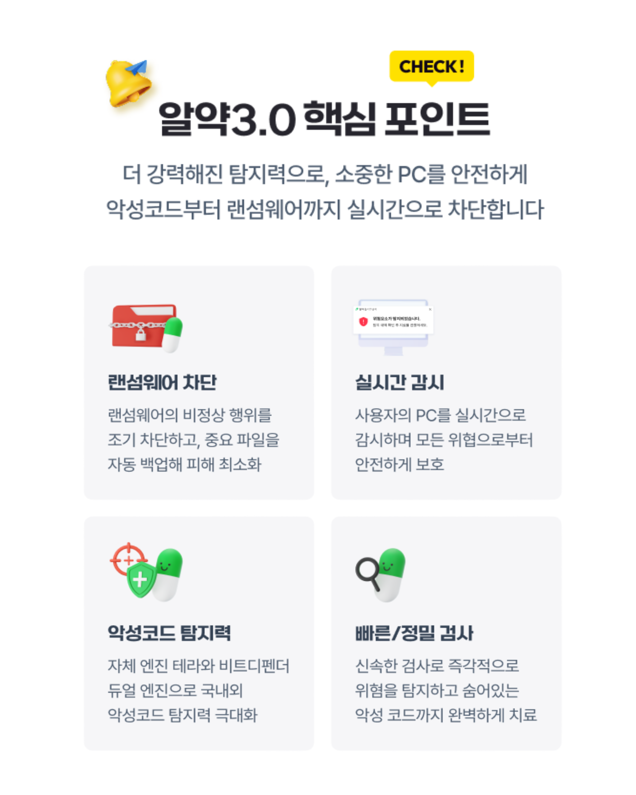 알약 3.0은 차세대 행위 기반 엔진을 적용해, 랜섬웨어와 신종 악성코드를 사전 차단하는 데 최적화된 PC 보안 환경을 제공합니다.