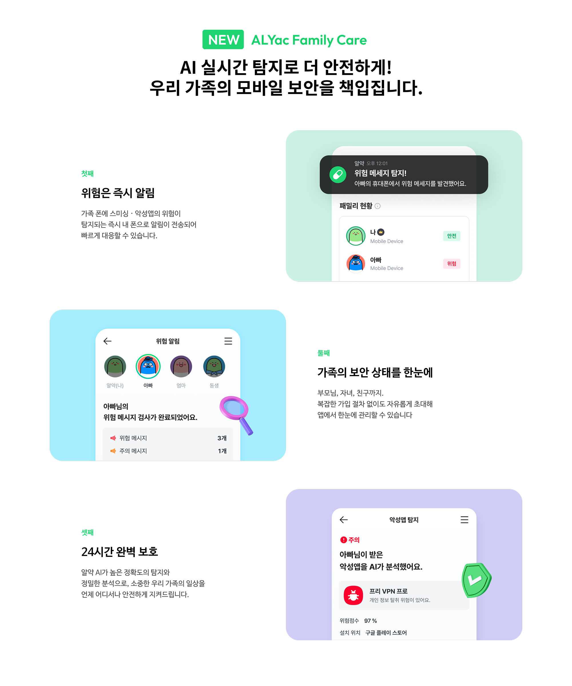 알약 모바일 앱의 '패밀리케어'는 AI 기반 스미싱 분석과 가족 보호 기능을 강화한 모바일 보안 서비스로, 최근 증가하는 '맞춤형 스미싱 패턴' 대응에 효과적으로 설계되었습니다.
