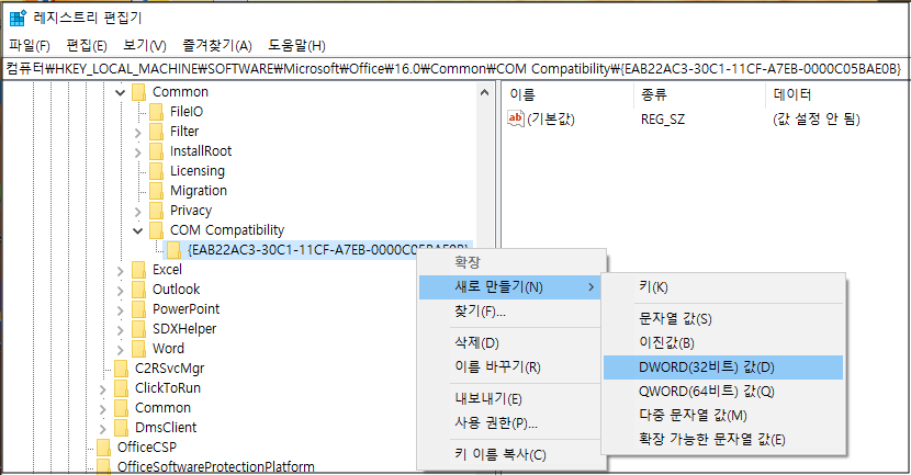 (COM Compatibility 키가 없다면 상위 키에서 마우스 우클릭 후 [새로 만들기 > 키]로 생성합니다.)