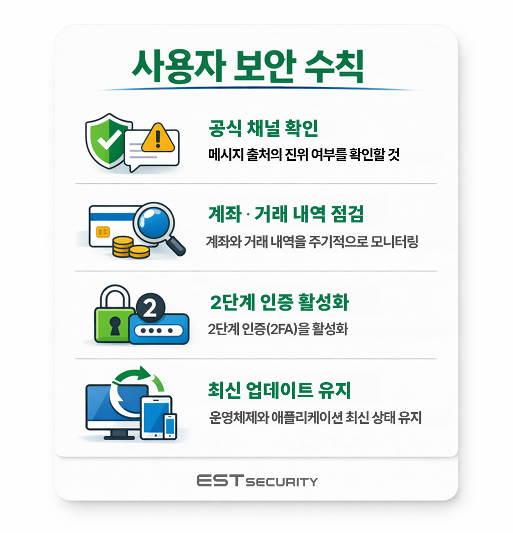공식 채널이 아닌 메시지는 반드시 진위 여부를 확인할 것, 계좌와 거래 내역을 주기적으로 모니터링할 것, 2단계 인증(2FA)을 활성화할 것, 운영체제와 애플리케이션을 최신 상태로 유지할 것 등이 핵심입니다.