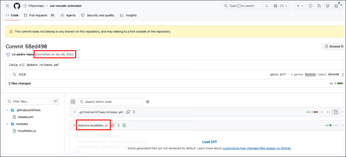 해당 버전의 확장 프로그램이 활성화되면, Checkmarx의 공식 GitHub 저장소에 2022년으로 날짜를 위조하여 삽입된 고아 커밋(orphaned commit)에서 약 10MB 크기의 악성 자바스크립트 파일(mcpAddon.js)을 다운로드하여 Bun 런타임으로 실행합니다.