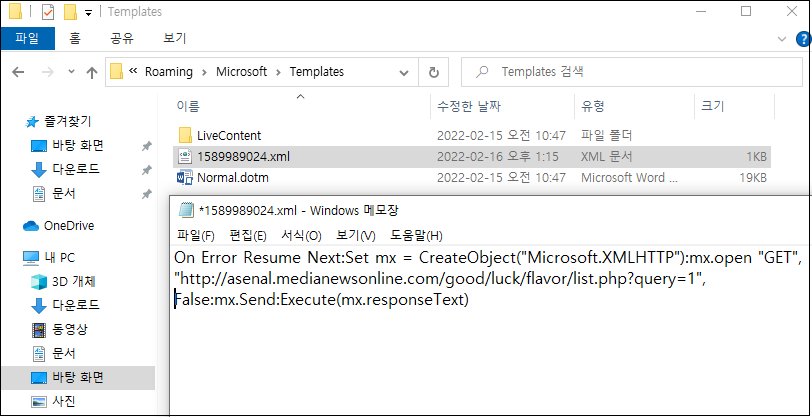 매크로가 실행되면, xml 형태로 파일이 드롭되며 드롭된 파일은 자동실행 후 C&C에 접속을 시도합니다.
