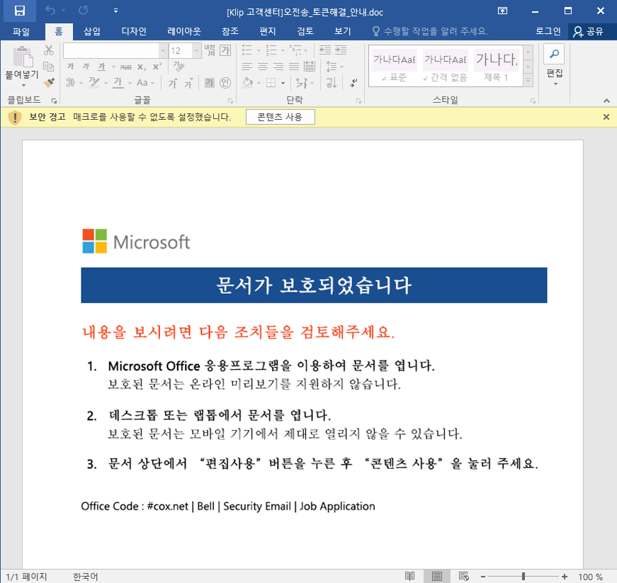 Klip은 카카오의 블록체인 관련 자회사인 그라운드 X가 개발한 디지털 자산 지갑 서비스로, 이번에 발견된 파일은 '[Klip 고객센터]오전송_토큰해결_안내.doc' 파일명으로 유포되었습니다.
